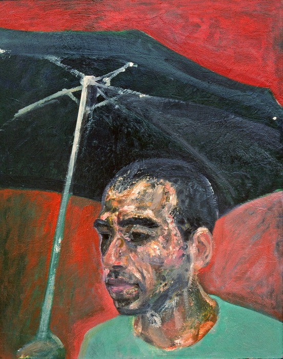 Self Portrait with Umbrella (2003). Oil on wood. 21 x 26 inches.